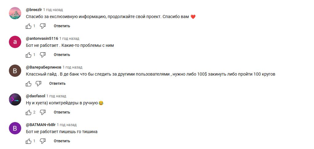 Пользователи заявляют, что боты не работают или критикуют цены. Негативных отзывов или пострадавших от мошенничества нет.
