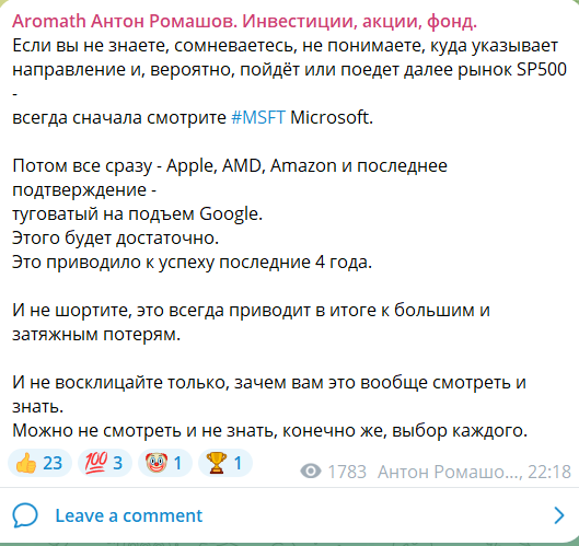 Aromath торгует не только на российских биржах, но и на американских и европейских. Например, в одном из постов автор дает совет, согласно которому при анализе рынка нужно начинать с акций Microsoft. Также трейдер не рекомендует использовать шорт-позиции при торговле.