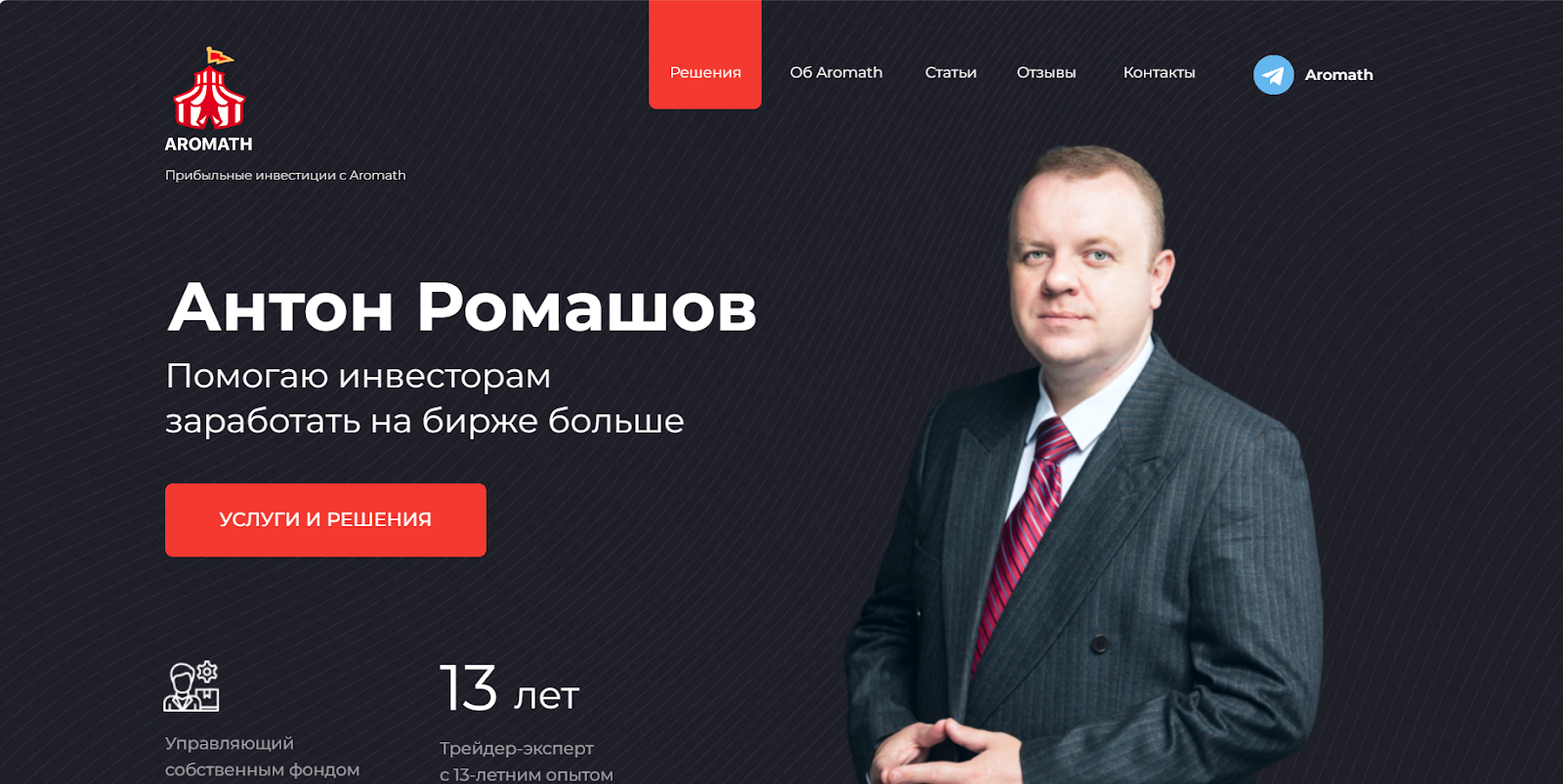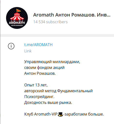 Канал Aromath принадлежит успешному трейдеру Антону, который, благодаря многолетнему опыту, сумел создать собственную фондовую биржу и начать управлять миллиардами, а затем перешел и на трейдинг в медиа, создав канал в Telegram. Используя бесплатный контент, Антон получил доверчивую аудиторию, решившую покупать и платный, чтобы заработать больше прибыли.