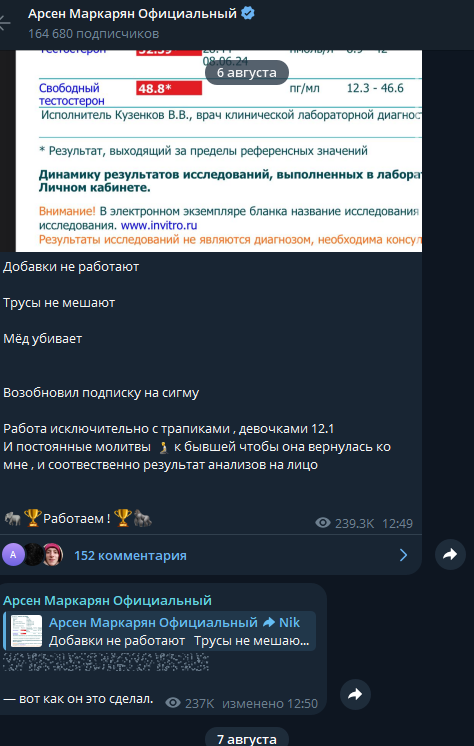 По инсайдерской информации в телеге Арсен постит всё, что ему вздумается: разумные и не очень мысли, сомнительные советы по употреблению препаратов и тестобустеров – обманом продвигая различные препараты, Маркарян создает секту людей, которые без его рекомендации не делают ни шага.