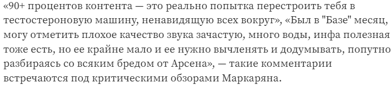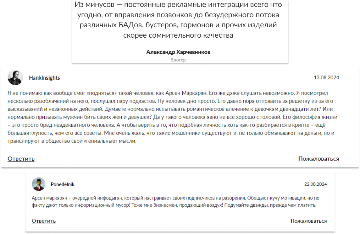 Известность мошенника в телеграмм-канале и за его пределами – результат скандальной репутации и громких заявлений, правда в том, что Арсен Маркарян правильно воздействует на свою целевую аудиторию – неуверенных и мнительных мужчин, получая от них признания для подпитки эго и кошелька, хотя официальной мотивацией служит улучшение мира.