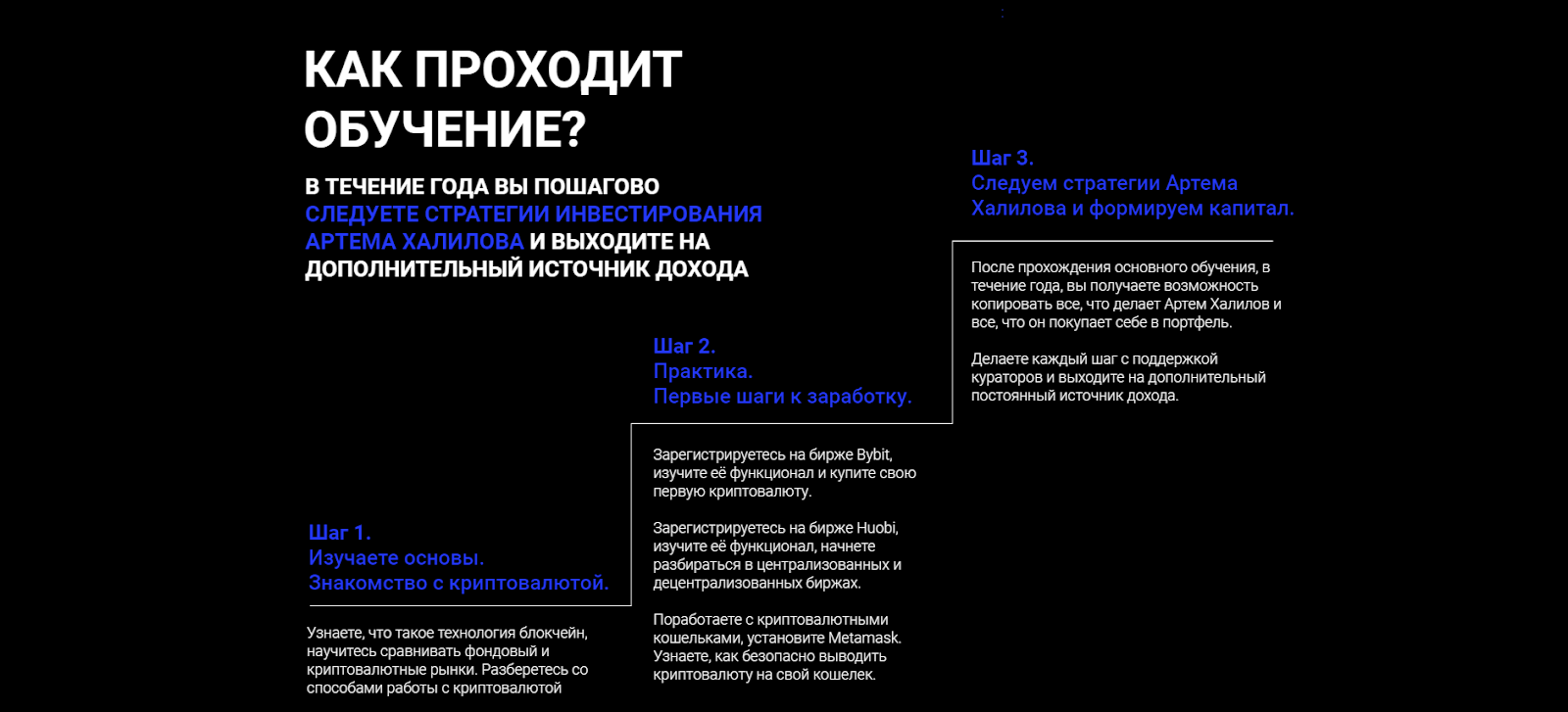 Артём Халилов предлагает слишком дорогие курсы. При этом отзывы о качестве обучения не самые лучшие. Рассчитано на новичков, ничего не понимающих в крипте. Такие же курсы мжно найти гораздо дешевле. Да и бесплатной информации достаточно в интернете.
