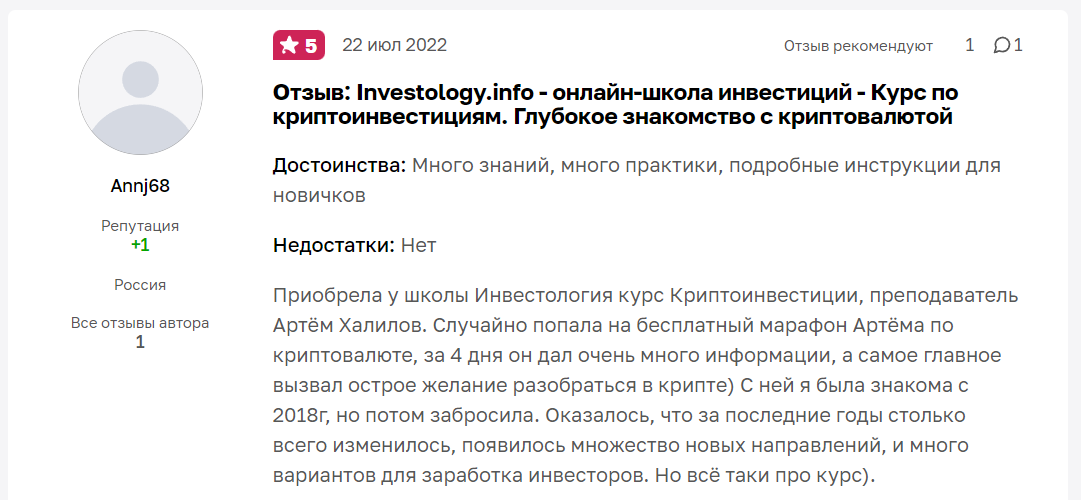 В результате обзора мы узнали, что Артем Халилов предлагает пройти курс “Инвестолоджи крипто”. В нем он рассказывает о том, как научиться зарабатывать на крипте. Хотя в сети у него положительная репутация, мы хотели бы обратить внимание на ряд недостатков: