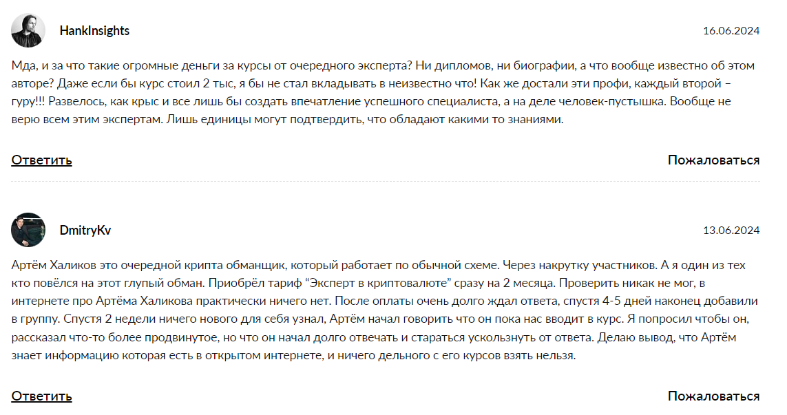 В негативных отзывах о курсах Артема Халилова пользователи отмечают, что всю информацию можно найти в открытом доступе. Они утверждают, что стоимость обучения слишком высокая и не соответствует материалам в нем.