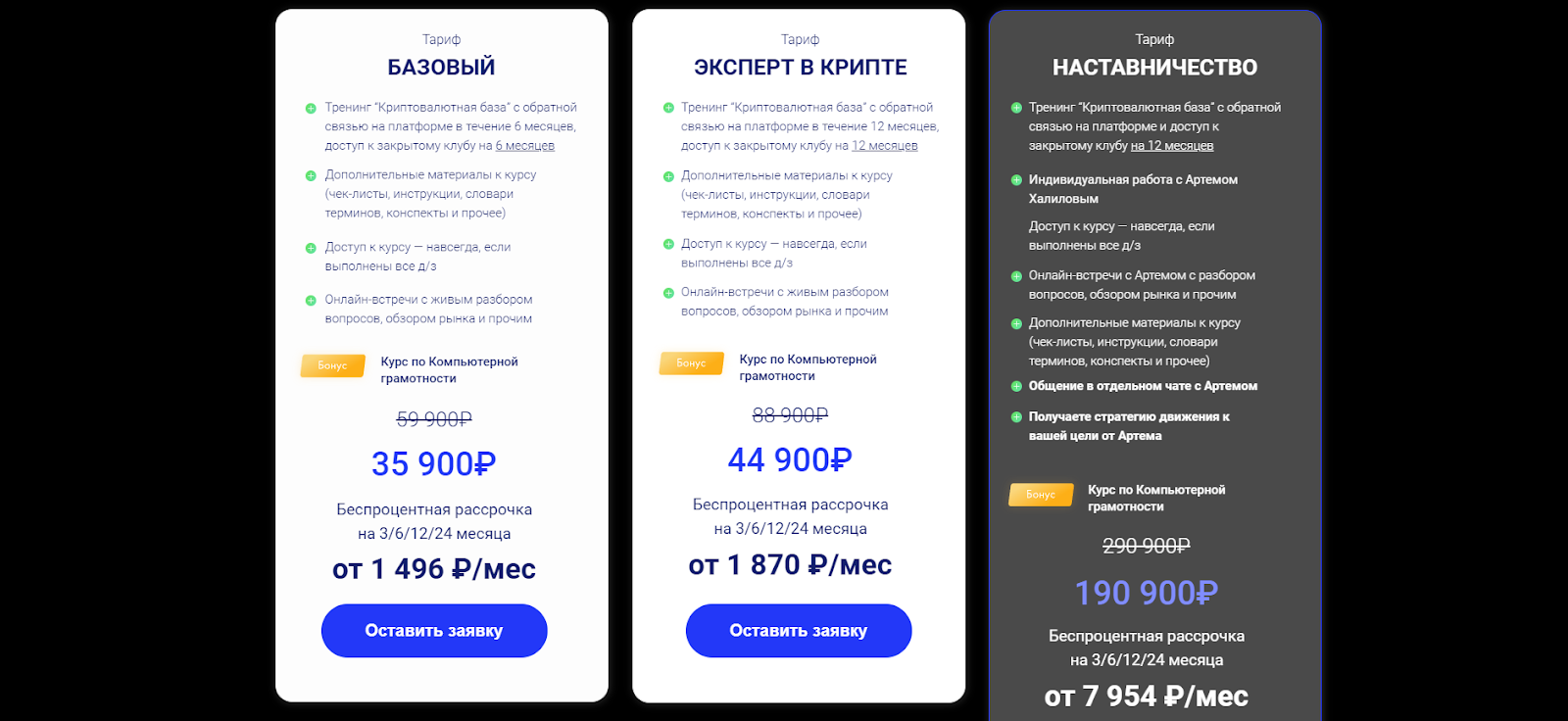 Основной курс Артема Халилова — “Криптобаза”. Он рассчитан на начинающих инвесторов, которые плохо знакомы с инвестициями в крипту. Доступно 3 тарифа: