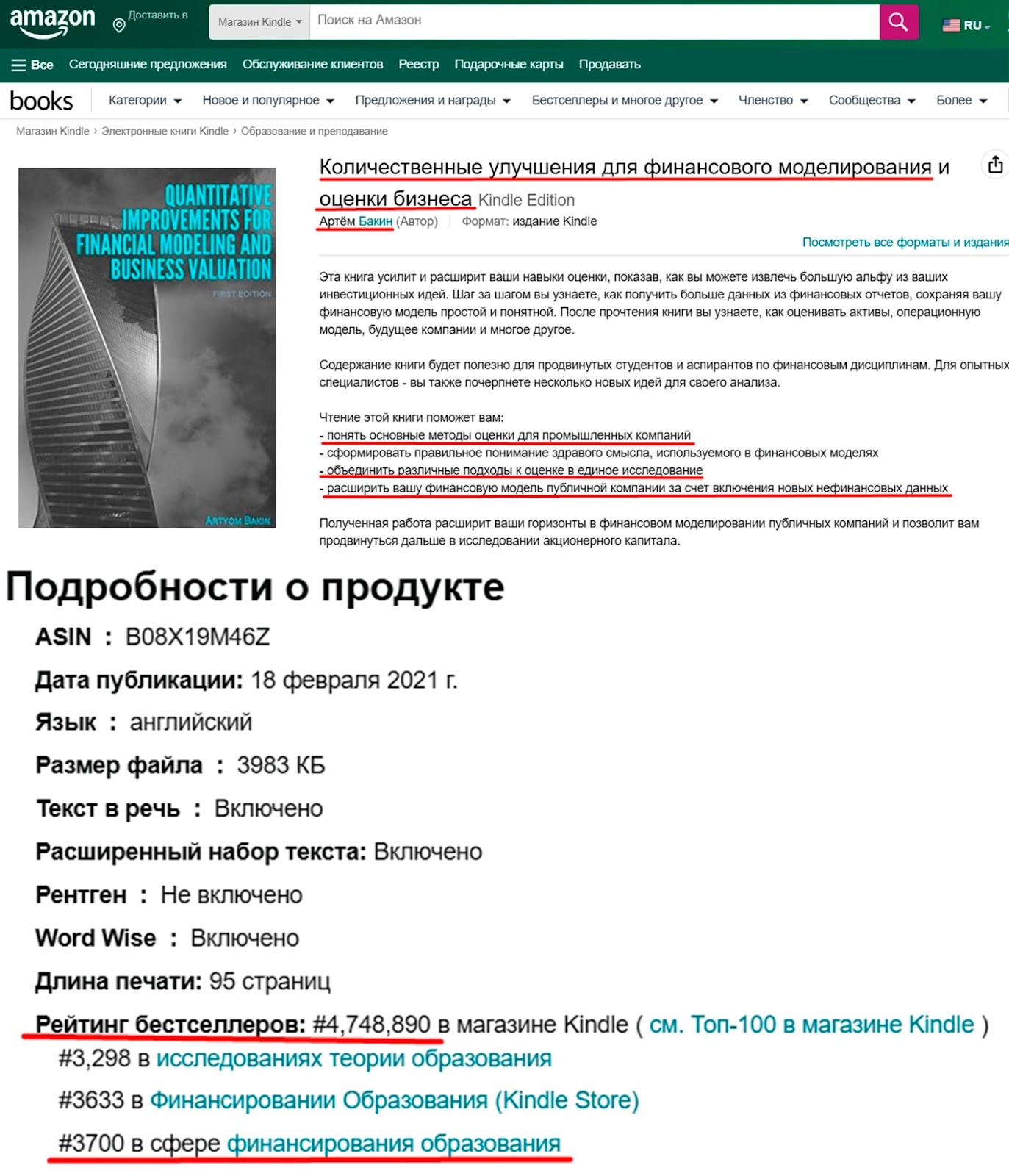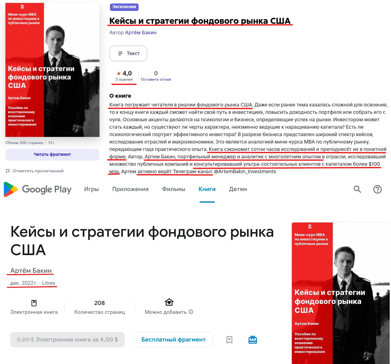 Артем Бакин автор 2 публикаций. Например, книга про кейсы и стратегии фондового рынка США доступна на 20 сайтах. Инвестор сообщает, что прочтение его работы сэкономит пользователям сотни часов самостоятельных исследований. На сайте litres ru книгу оценили на 4,0.