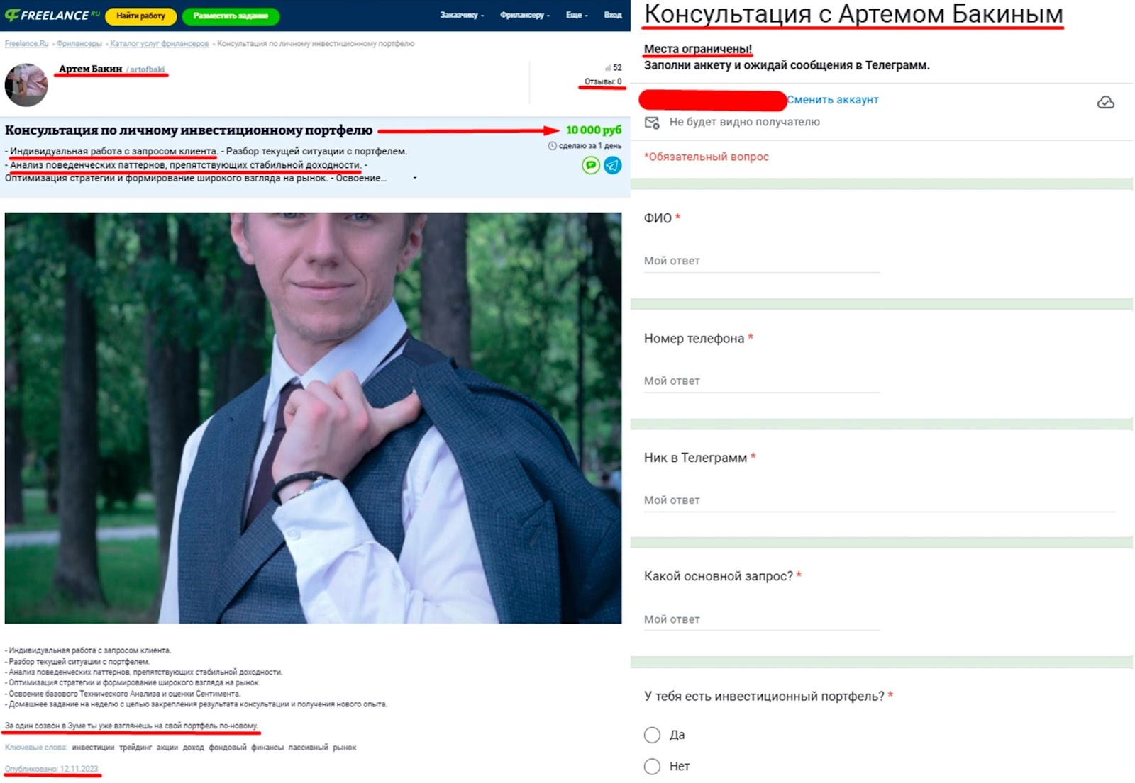 Дополнительно Artem Bakin занимается консультированием по личному инвестиционному портфелю. Стоимость одной сессии составляет 10 тысяч рублей. Клиент получит анализ причин, которые мешают стабильному доходу. Чтобы записаться на консультацию с Артемом Бакиным, нужно заполнить google-форму.