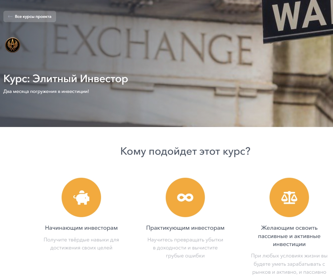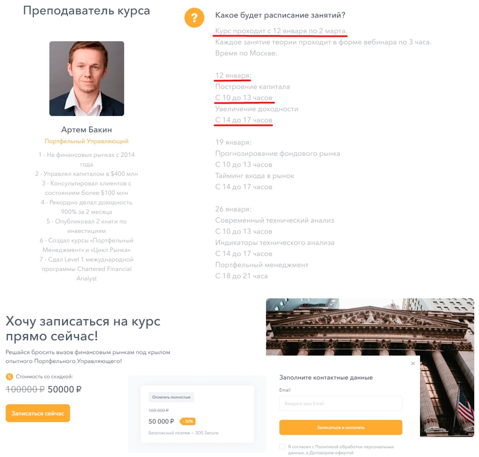 На сайте Artem Bakin представляется как преподаватель курса. Предприниматель указывает, что занимается инвестициями с 2014 года и управлял капиталом в 400 миллионов долларов. Обучение проходит в виде вебинаров 1 раз в неделю и включает 2 урока по 3 часа. Стоимость курсов 100 тысяч рублей, но сейчас действует скидка 50%.