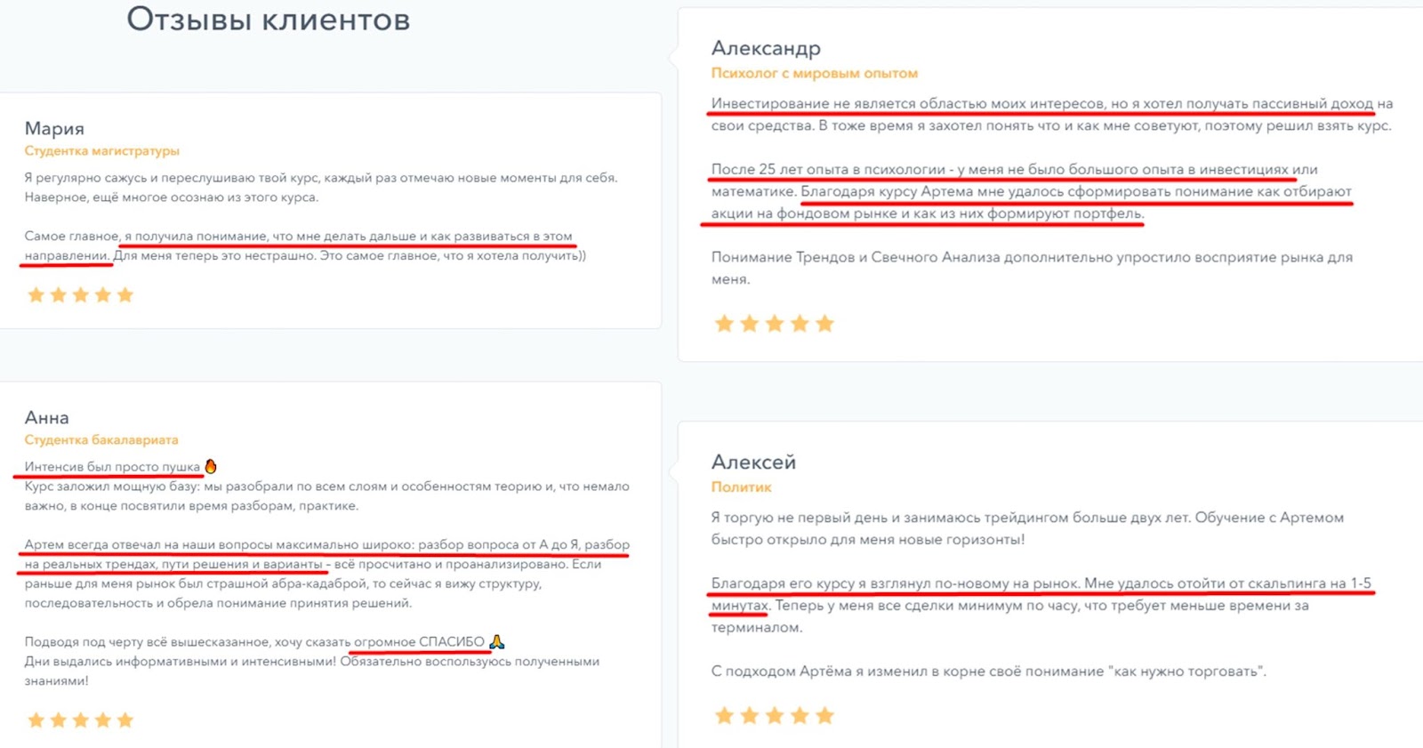 На сайте abakin investments skillspace ru есть блок с отзывами клиентов. Ученики пишут благодарные отзывы о курсах. Пользователи отмечают, что стали понимать как формировать портфель и торговать на биржах.