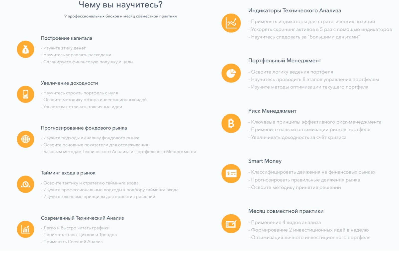 Курсы инвестиций Артема Бакина включают 9 блоков с теорией и 1 месяц практики. Например, предприниматель рассказывает как построить капитал и читать индикаторы технического анализа. Дополнительно Артем учит клиентов соблюдать риск менеджмент и тайминги входа в рынок.