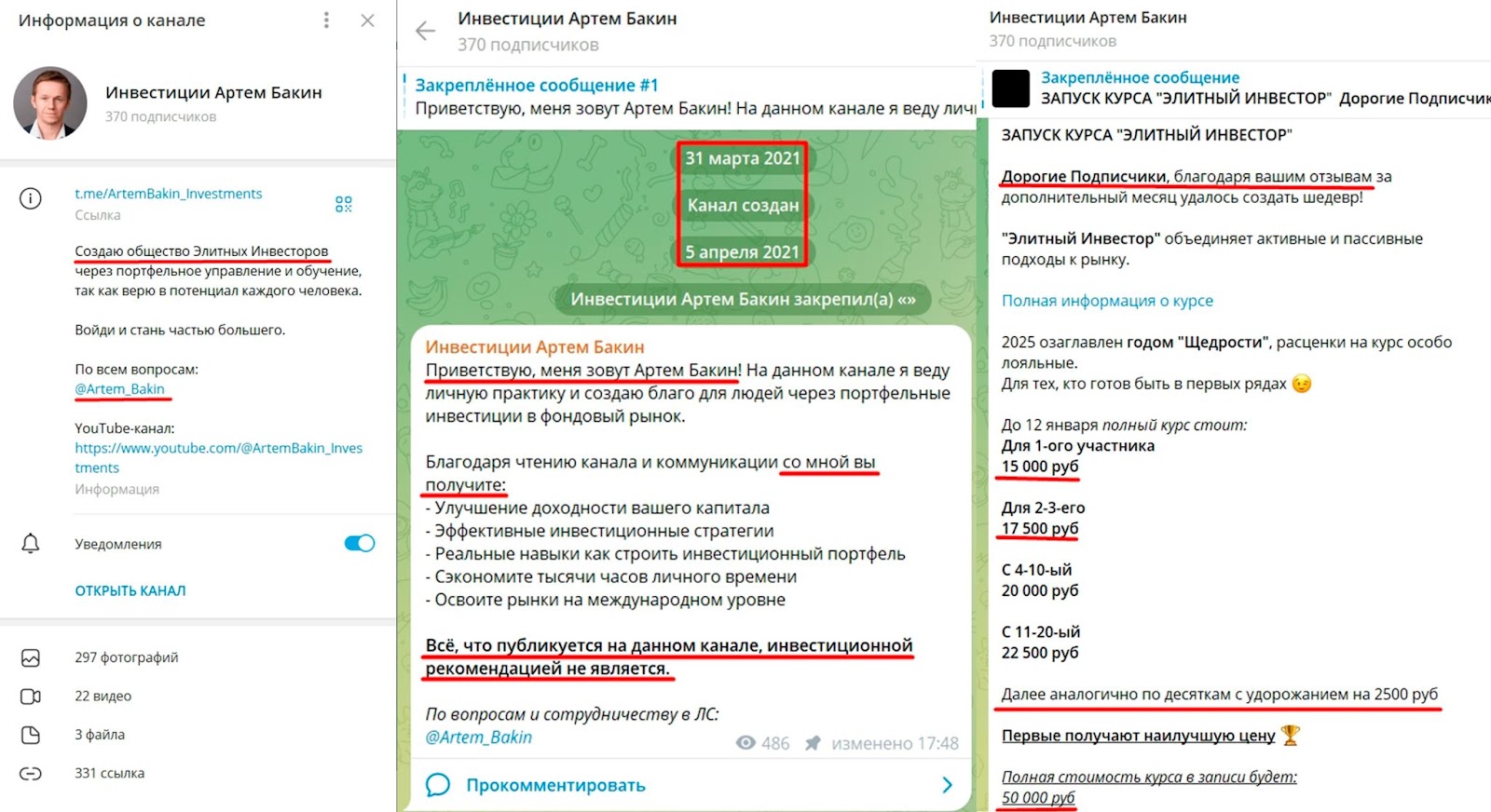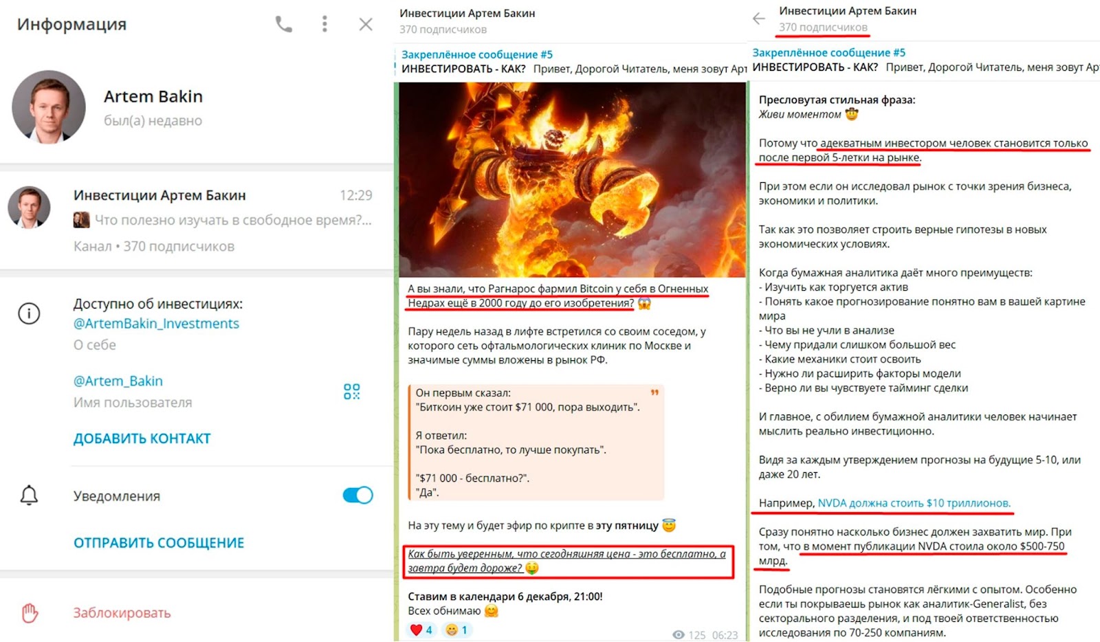 Для связи по обучению и консультированию предприниматель дает контакт в телеграм под ником Artem Bakin. Особенностью контента Артема можно считать необычный подход к подаче материала. Например, инвестор пишет, что до создания биткоина его фармил Рагнарос в 2000 году. Дополнительно админ пишет свои предположения по цене компаний в trillions dollars.