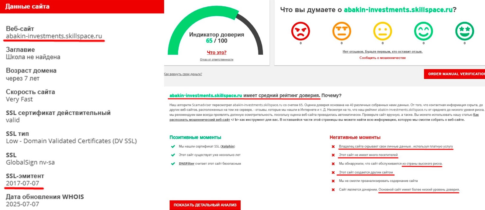 Домен создан в 2017 году, но имеет средний уровень доверия. Например, веб-страница abakin investments skillspace ru создается другим сайтом с более низким рейтингом. Платформу с курсами Артема Бакина посещает небольшое количество пользователей.