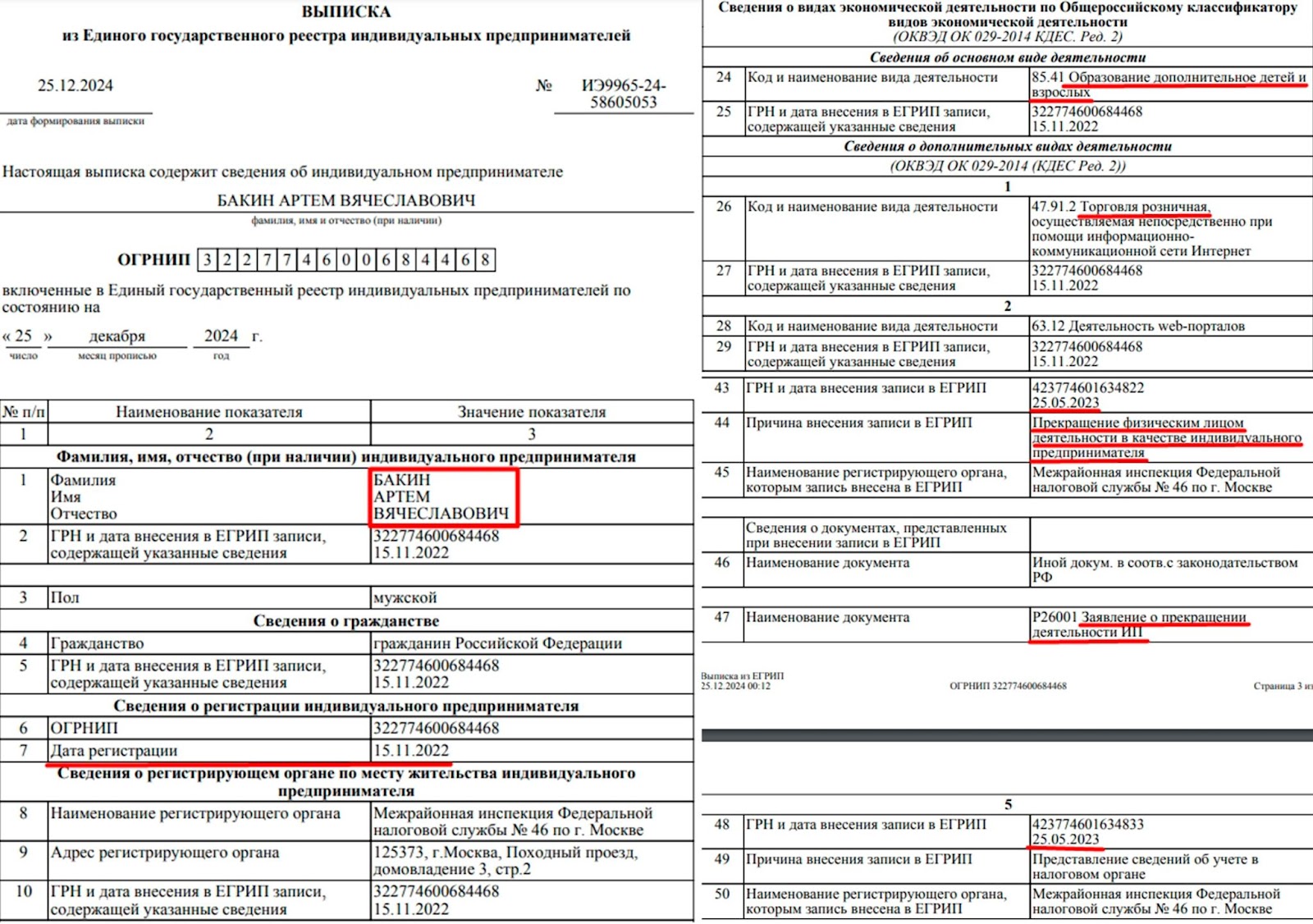 В выписке из ЕГРЮЛ пользователи могут ознакомиться, что Артем Бакин лицензировал образовательные и торговые услуги. Дата регистрации ИП 15 ноября 2022 года. Но 25 мая 2023 года деятельность ИП была прекращена. Это значит, что на декабрь 2024 года курсы и консультации Артема не регулируются.