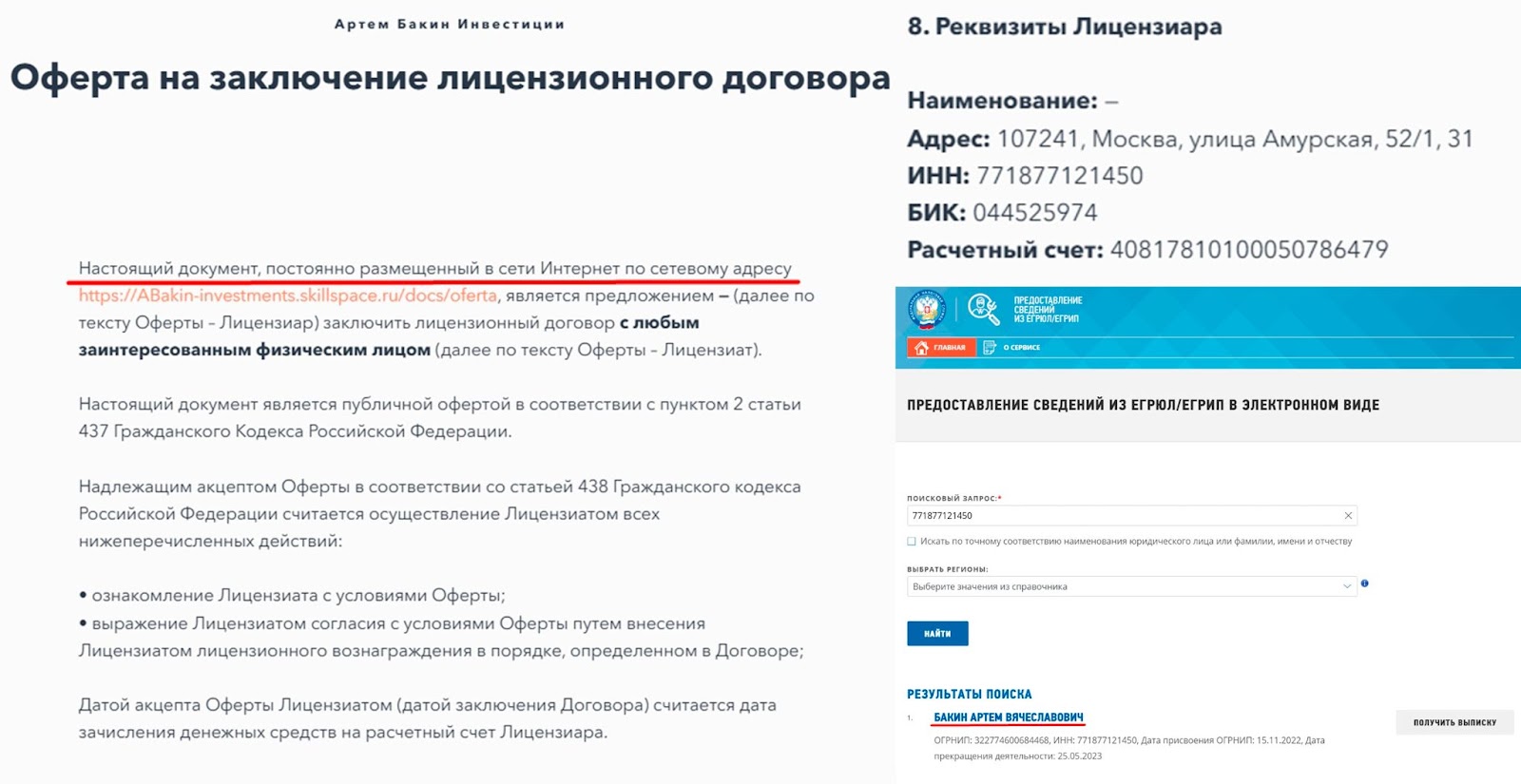 Преподаватель курса Artem Bakin работает через оферту на заключение лицензионного договора. На официальном сайте с данными по ЕГРЮЛ указано, что у инвестора открыто ИП.