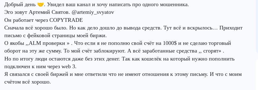 Об одноименном телеграм-канале Артемий Святов (artemiy svyatov) нет положительной обратной связи от довольных клиентов. На внешних мониторинговых ресурсах о проекте есть отрицательный фидбек. Негативная рецензия представлена жалобой на мошенничество со стороны Артема.