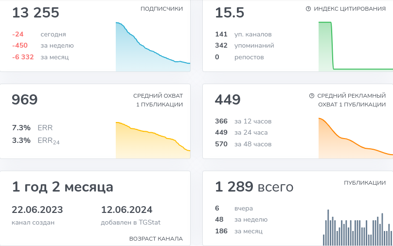 Инвестиционный проект создан 22.06.2023 года. За 1 год деятельности он собрал вокруг себя аудиторию из более 13 тысяч человек. На первый взгляд количество подписчиков у ТГ канала Артемий Святов (artemiy svyatov) большое, но реальная активность доказывает обратное. Итоговая вовлеченность клиентов в контент составляет 1.95%, а в целом посты читают 8%.