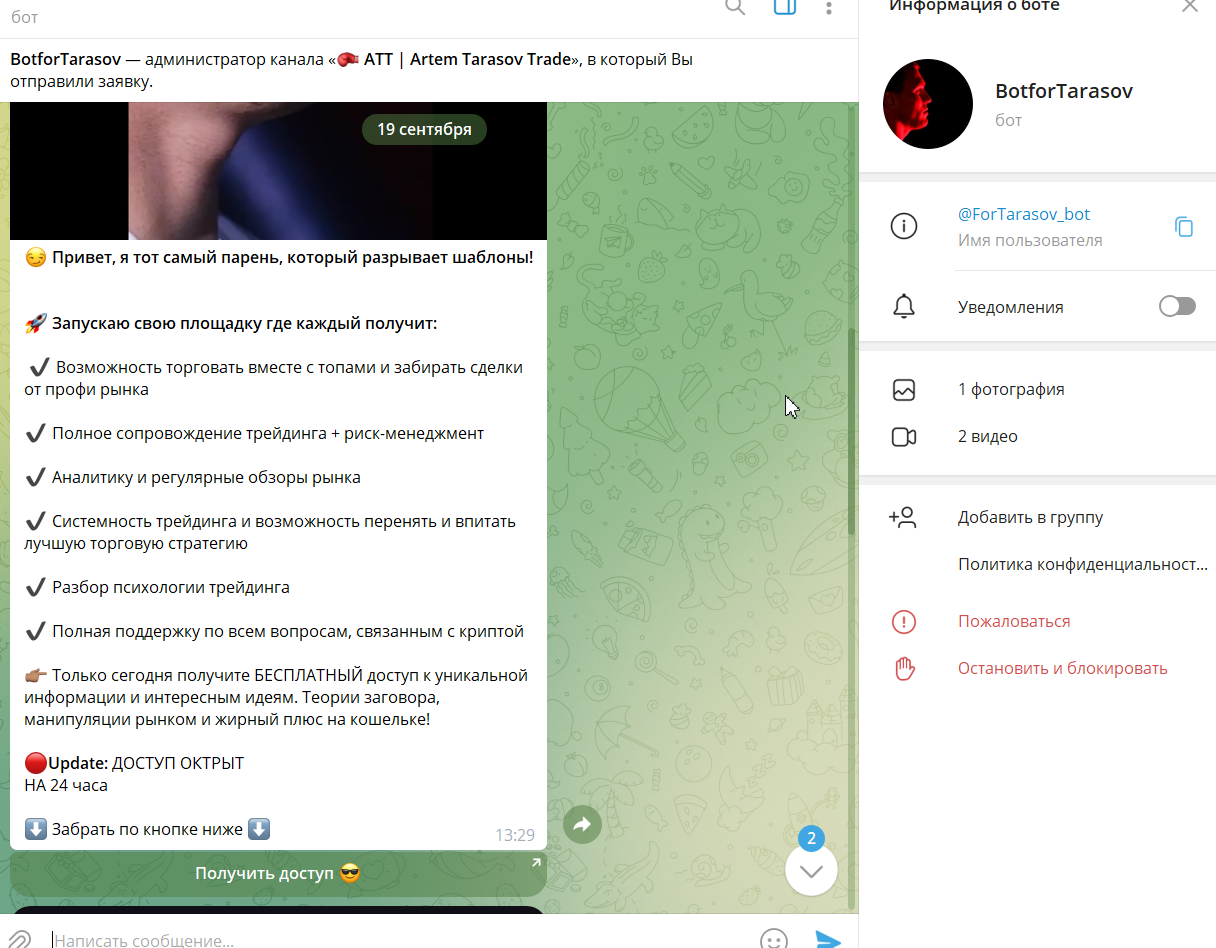 Artemtarasovlive – закрытый телеграм канал трейдера Артема Тарасова. На проект подписано 5,5 тыс читателей. Но присоединиться к нему можно только после одобрения заявки администрацией. Уже этим фактом artem tarasov вызывает подозрения. Обычно модерацию новичков используют мошенники – чтобы не впустить в сообщество настоящих финансовых экспертов, которые способны прилюдно раскритиковать схему обмана и насторожить более доверчивых инвесторов. Мы решили разобраться, насколько честно ведет свою работу Att Artem Tarasov Trade, и безопасно ли членство в сообществе.