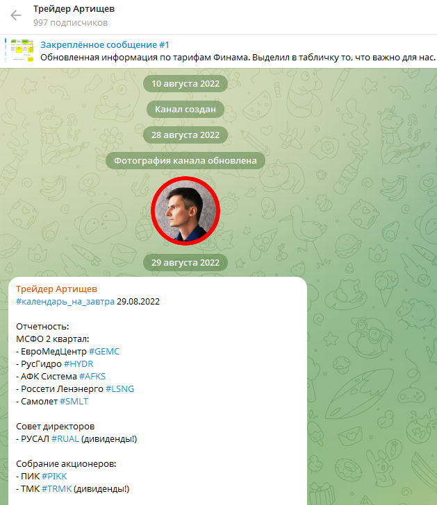 Канал трейдера Михаила Артищева создан в августе 2022 года. В первых публикациях он расписал свой календарь, при этом не раскрыл информацию о себе. В сентябре 2025 года на ресурс подписано 997 человек.