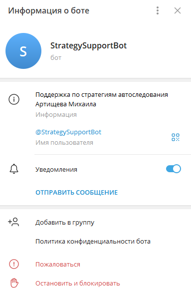 Чтобы связаться с известным трейдером, нужно было написать боту @StrategySupportBot. На данный момент он уже отключен и не реагирует на сообщения.