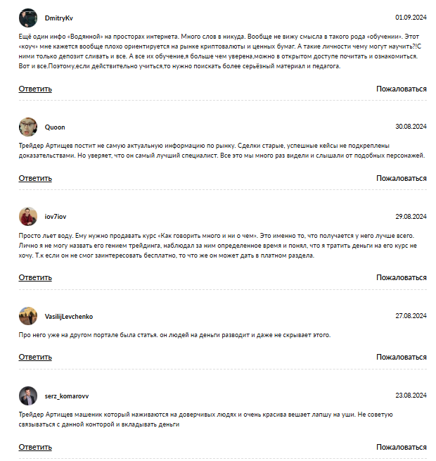 У трейдера негативная репутация, если судить по отзывам в интернете. Пользователи утверждают, что на сделках Михаила Артищева не получится выйти в плюс.