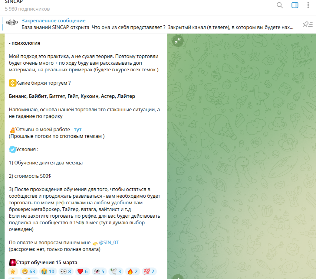 Обучение у коуча длится два месяца, стоит оно $500. После окончания учебы, следует торговать на биржах по реферальной ссылке трейдера. Только так, по словам «Артур SinCap» можно закрывать сделки с результатом «плюс».