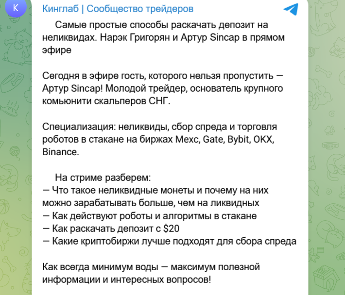 Обучение по крипте от «Артур SinCap» отзывы на тематических площадках не имеет. Админ комьюнити продает учебные гайды для успешной торговли криптоактивами на различных биржах. Автор является спикером и наставником в онлайн-академии проп-трейдинга «КингЛаб». В этом обзоре выясним, по какой стоимости можно приобрести обучение, также узнаем, на какие платформах можно применять полученные знания.