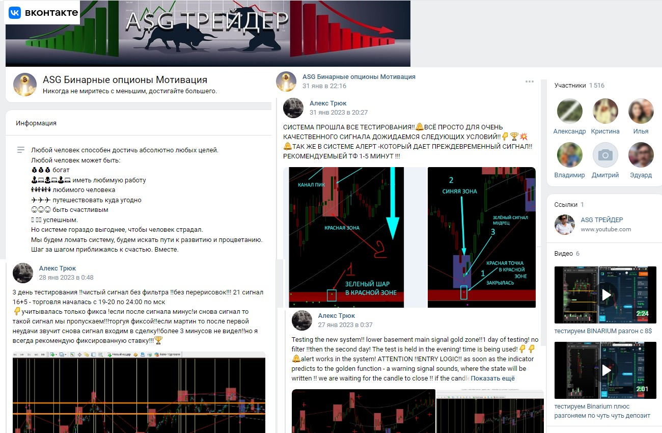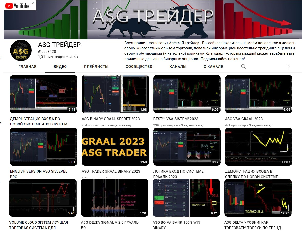 ASG трейдер — автор консультационных проектов «Бинарные опционы Мотивация» и VOLUMES ANALYSIS SYSTEMS, на базе которых Алекс Трюк рассказывает про финансовую торговлю. Создатель информационного паблика делится информацией с пользователями про актуальные рыночные тренды, как торговать на бирже в плюс, что и когда покупать, по каким сигналам продавать, чтобы выйти в плюс к прибыли. Вдобавок к этому, создатель сервиса предлагает программное обеспечение, которое якобы поможет закрыть ордера в плюс к прибыли.