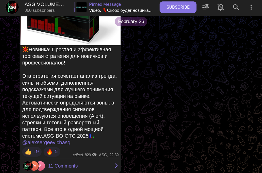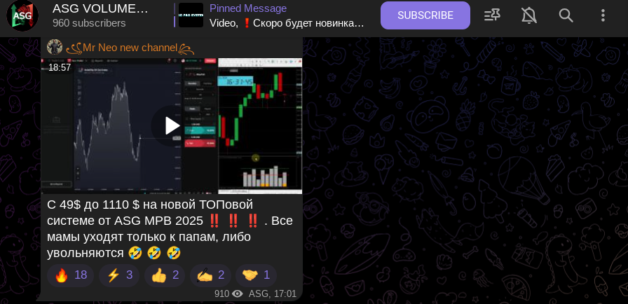 • Помимо телеграм-канала, разработчик информационного сообщества ведет YouTube, группу во Вконтакте. Автор ASG VOLUMES ANALYSIS SYSTEMS старается привлекать пользователей со всех упомянутых площадок, но получается это у админа ASGTRADERGROUP плохо.