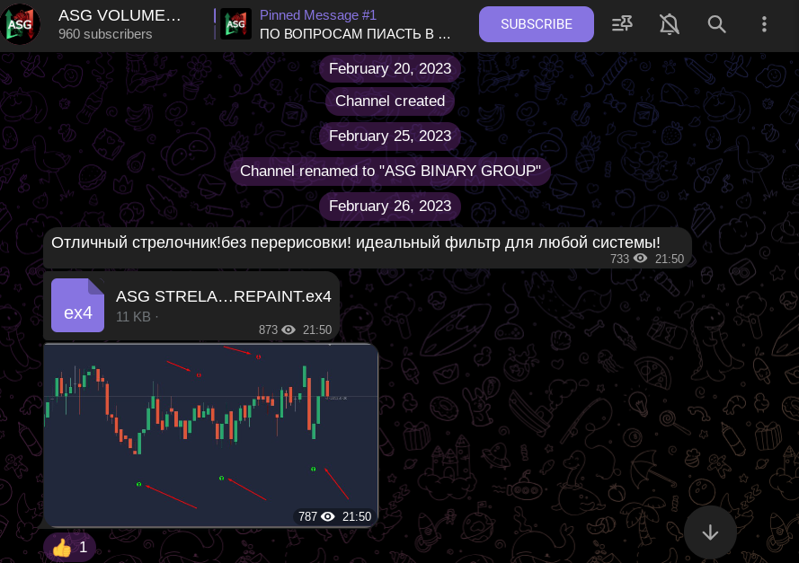 Вступительной публикации по финансовой торговли нет. Вместо нее, создатель консультационной платформы в телеграме прикрепил файл ex4 с фильтром для трейдинга. Публикации со знакомством трейдер ASG не прикрепил. Комментарии к последующим постам автор консультационного агентства ASGTRADERGROUP закрыл.