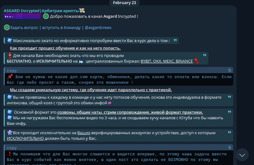 В Telegram-канале ASGARD Incrypted проекты делают упор на кейсы арбитража крипты, а бота представляют как автоматизированного помощника, помогающего формировать ордера. При этом нет публичной обработки истории сделок, расчетов реальной прибыли, к чему стоит относиться с осторожностью: для P2P схем характерно отсутствие подтвержденных аудитов и декларируемый доход часто не совпадает с фактическим.
