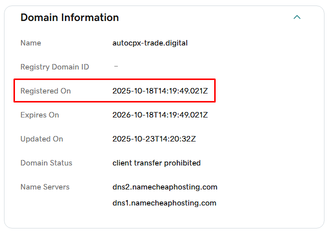 - Молодой домен Autocpx Trade Digital: он был зарегистрирован только в октябре 2025 года, большинство мошеннических проектов «живут» очень мало из-за накопления негатиных отзывов о своей работе и быстро меняют названия.