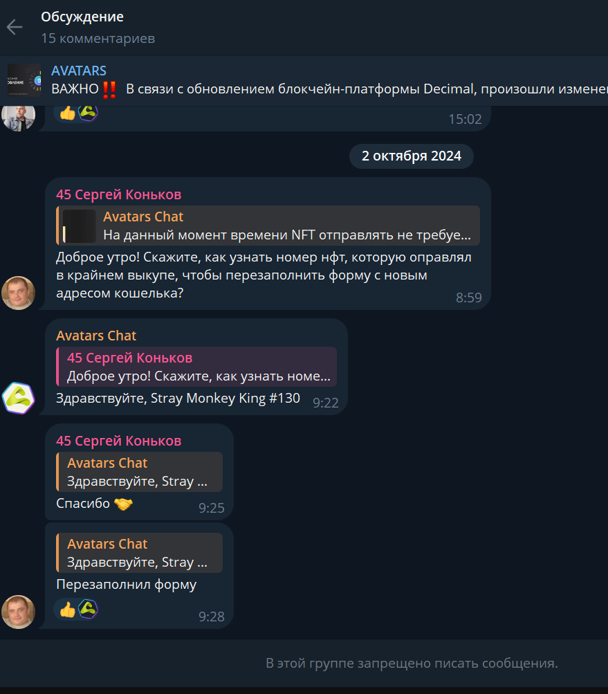 На канале в Телеграмм с ником AvatarsGroup менее 300 подписчиков, а последний пост набрал 700 просмотров, но особого смысла в изучении статистики нет, потому что с сентября 2024 года не было ни одной публикации. В группе 240 участников, но общение в ней отключили, что выглядит подозрительно, тем более, в совокупности с другими нерабочими ссылками.
