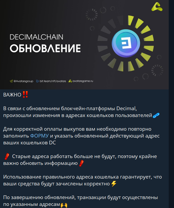 Владельцы последний раз писали о том, что блокчейн Decimal обновился, поэтому всем пользователям нужно сменить кошельки, но после такого сообщения никаких новостей нет.На канале говорили о больших планах и новых возможностях, но судя по тому, что связаться с представителями сервиса в марте 2026 года нельзя, вряд ли можно предполагать какие-то перспективы, поэтому прогнозы о проекте только плачевные.