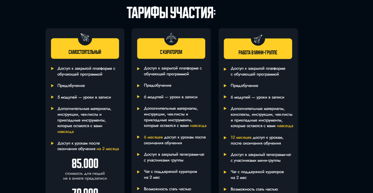 - Самостоятельный — предоставлен доступ к закрытой площадке. Есть 5 модулей, доп. материалы, инструкции, доступ к урокам после окончания учебы на 2 месяца. Стоит 85 000 рублей без предзаписи, 70 000 руб. при оплате в рассрочку и 60 000 руб. при оплате картой