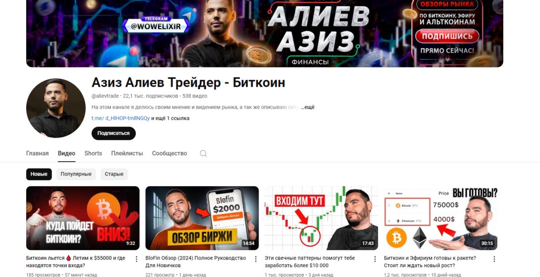 Помимо Телеграмма Alievtrade, Азиз Алиев ведет Ютуб канал о крипте Азиз Алиев Трейдер Биткоин. На него подписано более 22 тысяч пользователей.