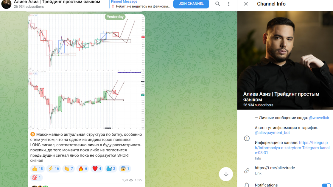 Трейдер в социальных сетях и на платформе azizaliev pro предоставляет базовую информацию о себе. Исходя из данных, Азиз Алиев работает с криптой более 10 лет. Никаких документов или подтвержденной статистики по сделкам мужчина не предоставляет. Настоящий профессионализм находится под сомнением. Телеграмм канал Алиев Азиз Трейдинг Простым Языком автор ведет с 2018 года. Сейчас на него подписано 26.9 тысяч пользователей. Просматривает посты половина аудитории, что является хорошим результатом. По поводу любых вопросов нужно обращаться к админу Aziz Aliev Wowelixir.