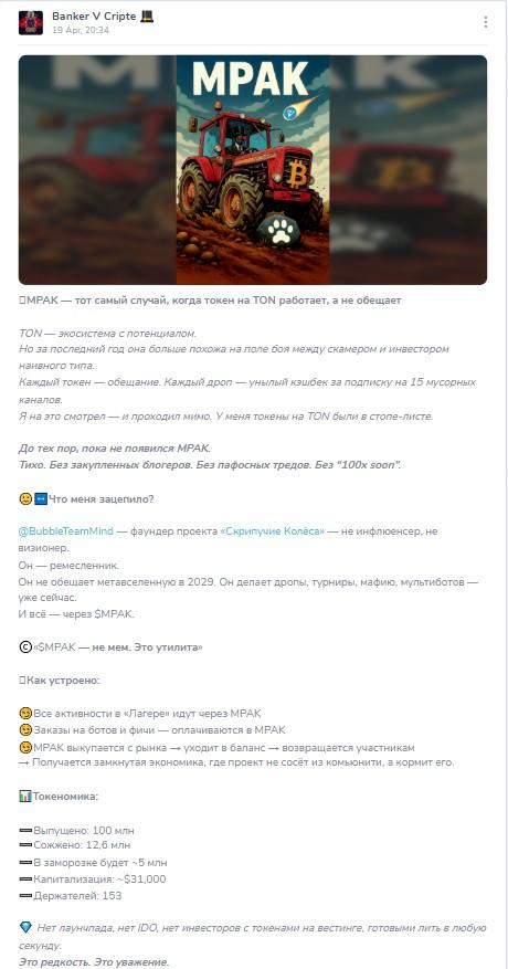 На телеграм-канал Banker V Cripte (bankervcripte) подписано сейчас 22 416 человек. Посты читают в среднем 7 500 участников. Комментарии открыты, обсуждение ведут примерно по 150 подписчиков. Вовлеченность аудитории не очень высокая, возможно, производилась накрутка. Но все же видно, что сообщество пользуется популярностью у подписчиков. На канале автор делится разными обзорами, новостями, все подробно расписывает, иногда рекламирует сторонние проекты.