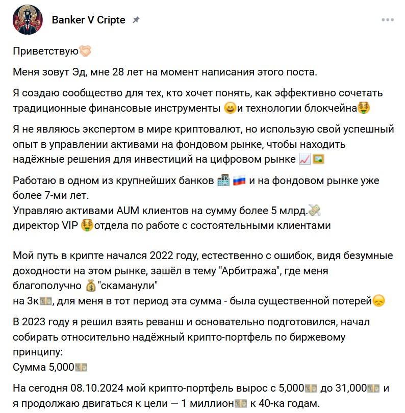 Banker V Cripte – телеграм-канал, посвященный криптовалюте и инвестициям. Создатель – некий Эд. Он позиционирует себя как опытного инвестиционного банкира и заявляет, что в своей группе делится стоящими стратегиями, разоблачает проекты-скамы и приносит исключительно практическую пользу. Мы решили проверить, насколько это достоверное обещание. К какому выводу пришли, расскажем далее.