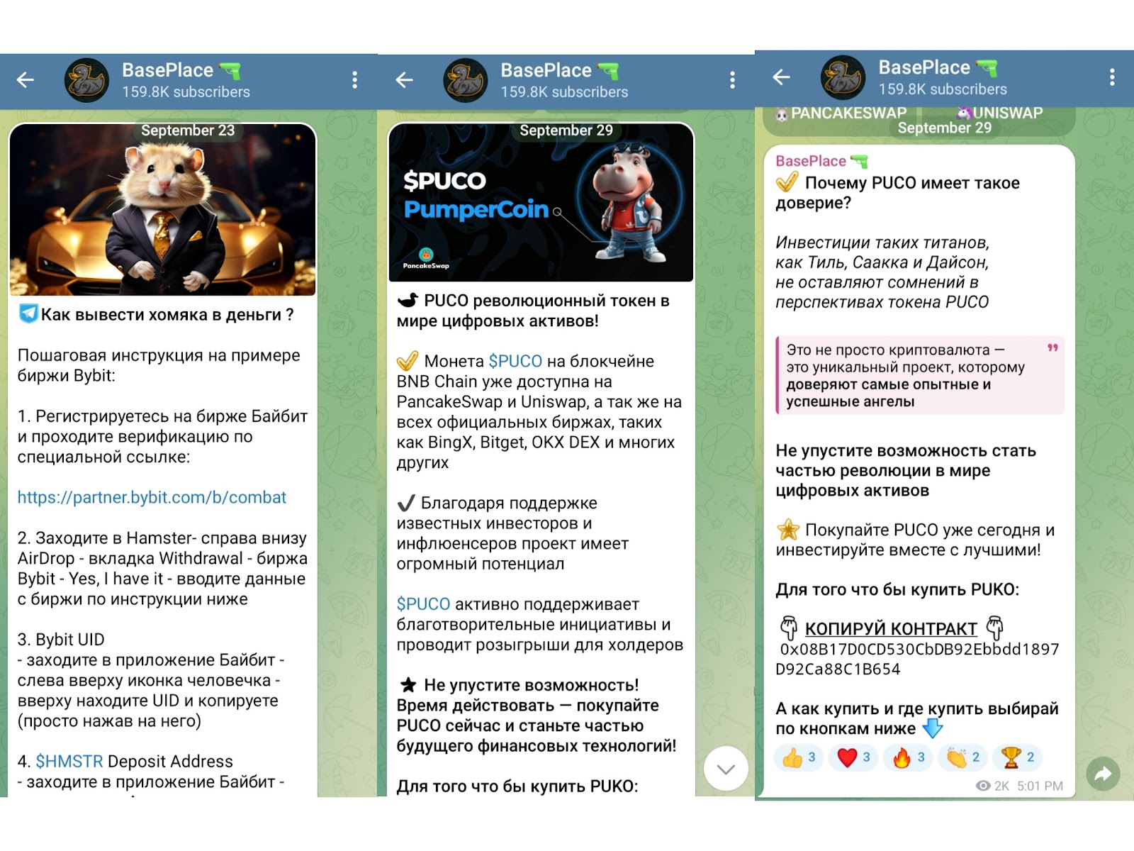 В сообществе размещена информация о крипто-проектах. Например, админ информирует об игре ВЕБ3 Captains Bay. Размещает преимущества проекта и оставляет ссылку на игру. В ленте паблика можно увидеть новости о Monkey, NotPixel и Хомяке. Иногда трейдер предоставляет сигналы по торговле. В таких постах указывает точки входа, тейки и стопы. Также отмечает риски. Верифицированной статистики по сделкам нет. Из-за этого проходимость сигналов под вопросом.Создатель блога оставляет партнерскую ссылку для создания аккаунта на ByBit. Из этого следует, что админ получает доход на рефералах. К признаку мошенничества со стороны основателя можно отнести рекламу скам-токена PUKO. Регулярно трейдер демонстрирует сведения о монете, отставляет ссылки на контракты. Еще предоставляет подробный гайд по покупке монеты. Развод в том, что хонипот коин можно только приобрести. Продать монету будет невозможно.