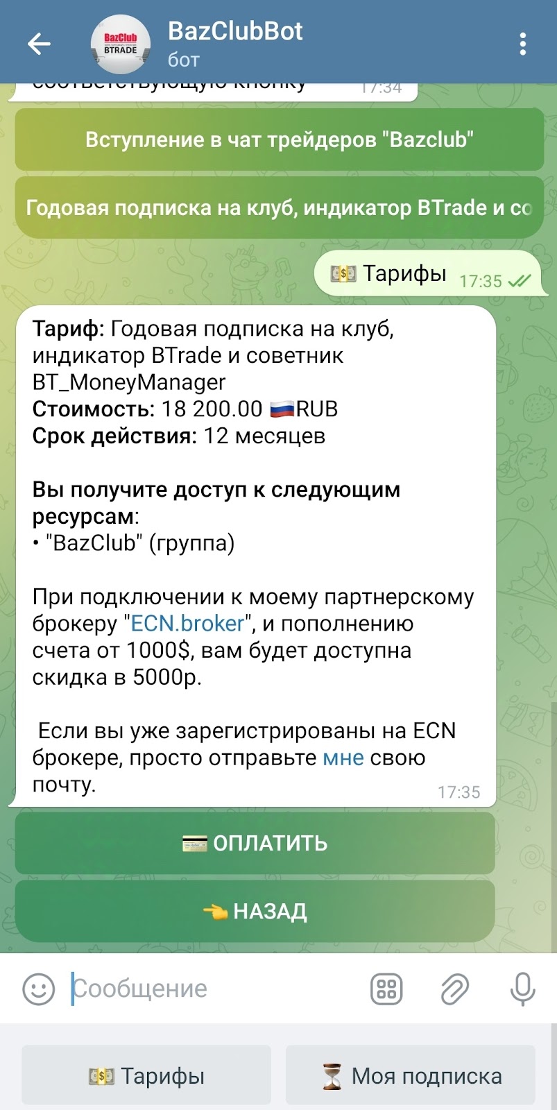 Можно воспользоваться и доверительным управлением, но его стоимость нигде не указана. Оплата происходит через сайт BazylevTrade com. Другие услуги трейдера можно оплатить через SignalsBazylevTrade bot. Среди них подписка на закрытый канал и вступление в чат трейдеров.
