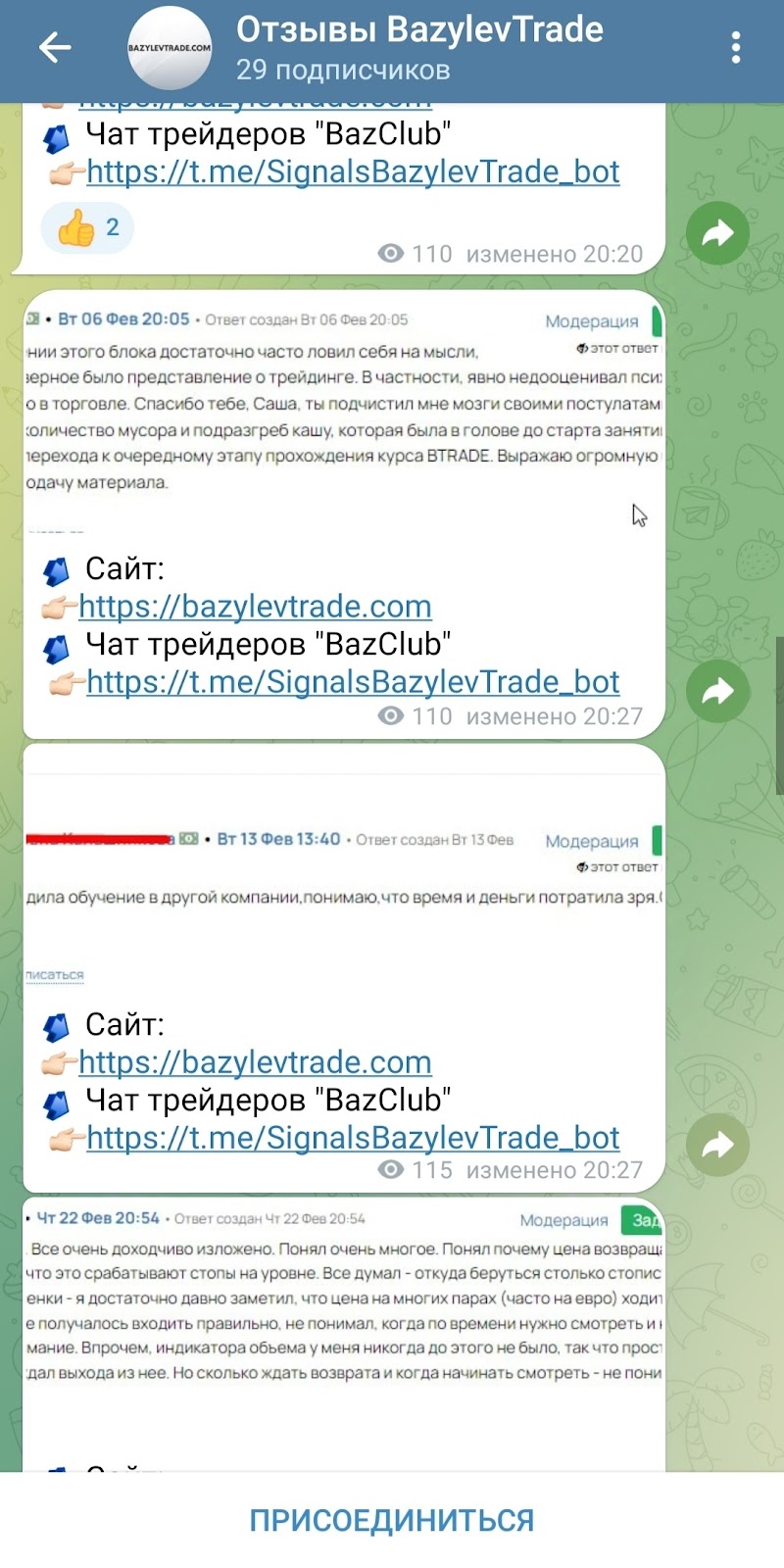 Трейдер самостоятельно создал канал Телеграмм BazylevTrade TG и публикует там отзывы от якобы очень довольных учеников. Выглядит это совершенно нереалистично.