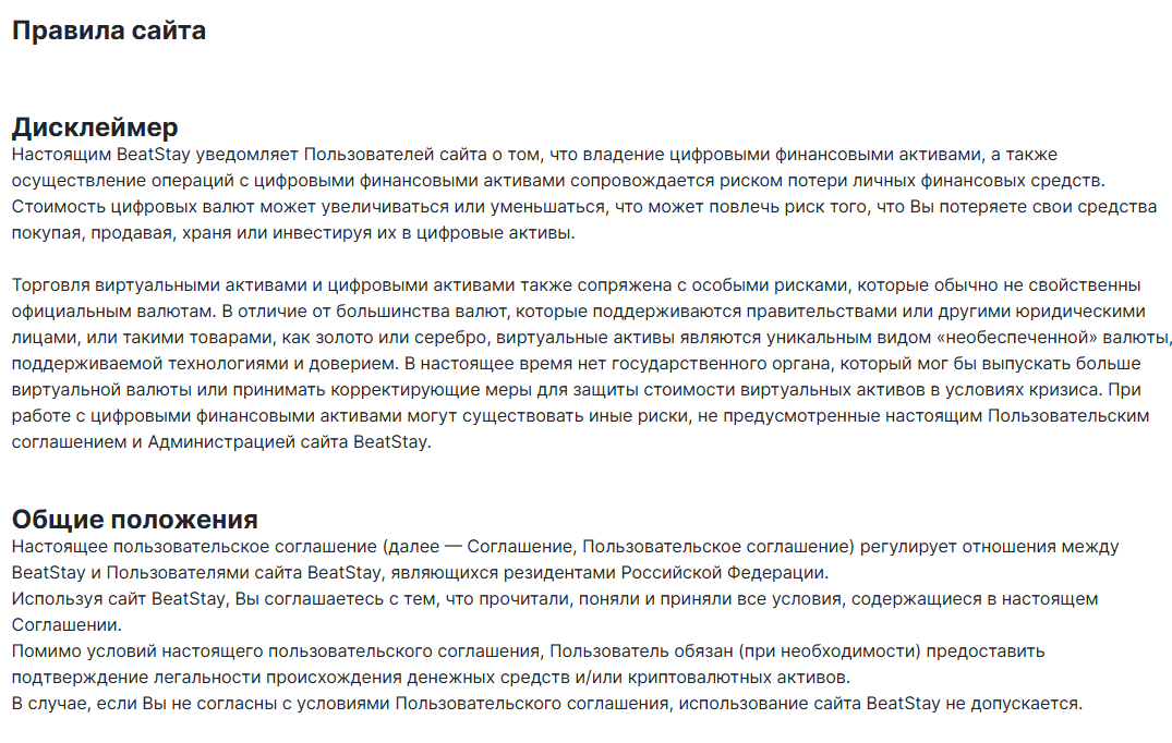 Пользователям также обещают оперативную поддержку, которая якобы работает 24/7. Однако она не то, что не функционирует круглосуточно, она вообще не функционирует. Ссылка на профиль в Telegram Beatstay manager никуда не ведет – аккаунт либо удален, либо сменил логин. Т.к. это единственный способ связаться с саппортом, получается, что при возникновении проблем помощь сервис фактически не сможет оказать.Из каких-либо регулирующих документов здесь есть пользовательское соглашение, которое вообще ничего не гарантирует. Платформа не зарегистрирован ни в одном из известных финансовых контролирующих органов. Здесь также отсутствует любая контактная информация, даже номер телефона. Об адресах или именах даже не идет и речи.