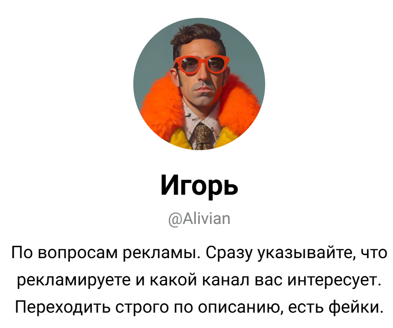 Для решения вопросов, которые касаются рекламы, важно обращаться по ссылке Alivian. Здесь видно, что трейдера зовут Игорь. Он предлагает фолловерам сразу указывать тип проекта, который продвигается, и интересующий канал. При этом пользователей предупреждают, что переходить необходимо строго по описанию.