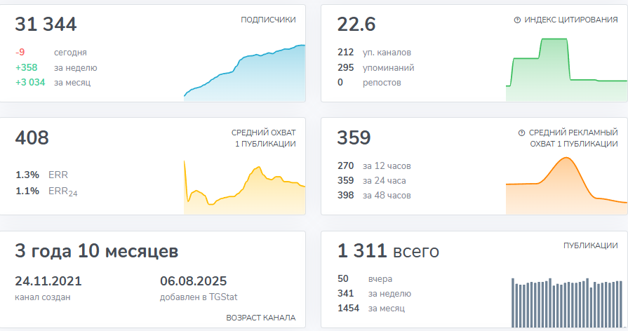 На канале 31 тысяча подписчиков. Посты читают 400 человек. Разрыв в 77 раз указывает на ботов. У живых каналов вовлеченность составляет 10–30 процентов. Здесь даже 2% нет.