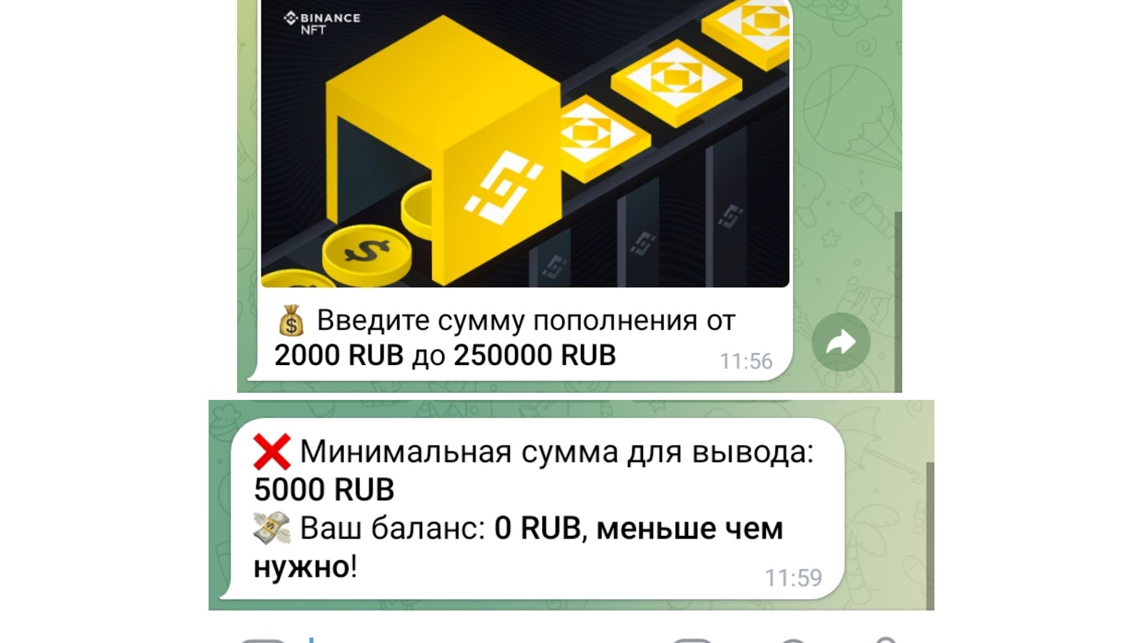 Проводить финансовые операции в Телеграм боте Бинанс НФТ нужно в личном кабинете. Вносить депозит можно с помощью банковских карт или крипты. Минимальная сумма пополнения — 2 тыс. рублей. Максимальная — 250 тыс. рублей. Вывести средства можно с суммой в 5 000 рублей.
