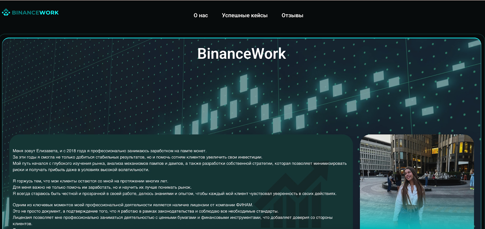 На веб-сайте binancework com Elizaveta Michyshkina демонстрировала красивую историю о своей успешной деятельности и положительные отзывы клиентов. Привлекательный рассказ автора не был подтвержден официальными документами. На портале отсутствовали ссылки на лицензию, брокерский договор, верифицированную статистику трейдера. Глядя на данный веб-сайт профессиональным взглядом складывалось впечатление о мошенничестве и разводе.