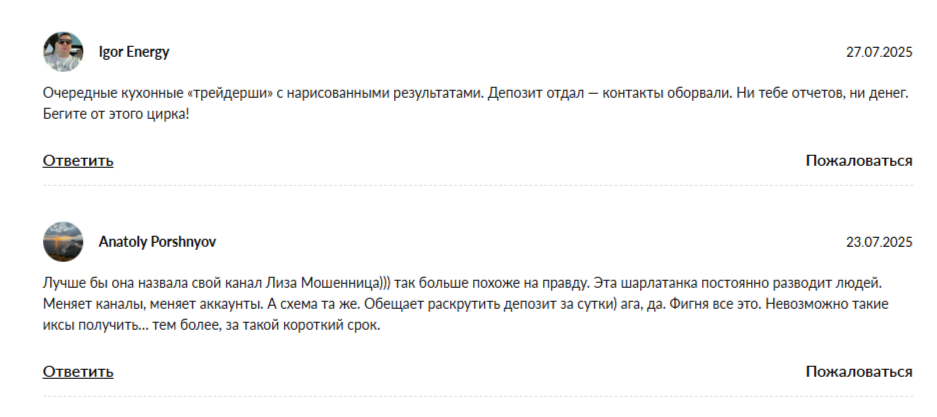 На сторонних ресурсах о трейдере Елизавете комментарии были обнаружены лишь отрицательные. В них барышню называют мошенницей и обвиняют в присвоении клиентских средств.