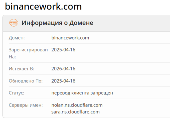 Веб-сайт платформы «Бинансе Ворк» имел банальный дизайн в темных тонах и три бесполезных раздела: «О нас», «Успешные кейсы», «Отзывы». Раздел «О нас» содержал рассказ о некой Елизавете, которая с 2018 года начала зарабатывать хорошие деньги на пампе монет. Данная барышня утверждала, что имеет лицензию от АО «ФИНАМ». Однако не предоставляла ссылку на документ.В процессе обзора портала binancework com мы получили следующие результаты. Домен был зарегистрирован 16 апреля 2025 года. Молодой возраст платформы исключает длительную работу на ней эксперта в торговле с опытом 7+ лет. Сайт Банка России не содержит никакой информации о связи фейкового трейдера с организациями, имеющими право на брокерскую деятельность.