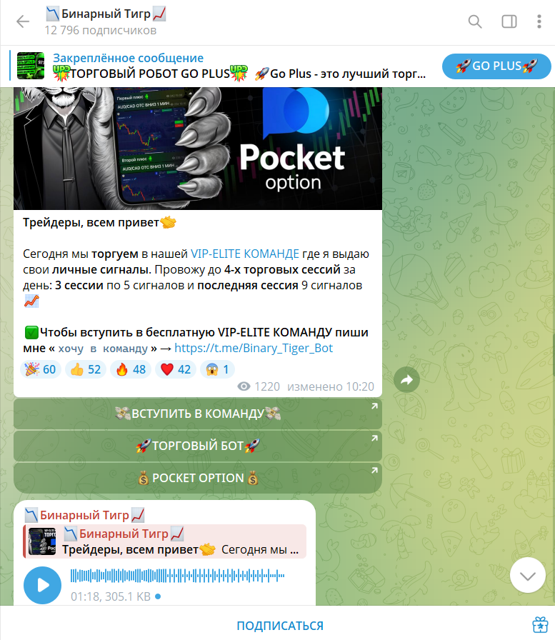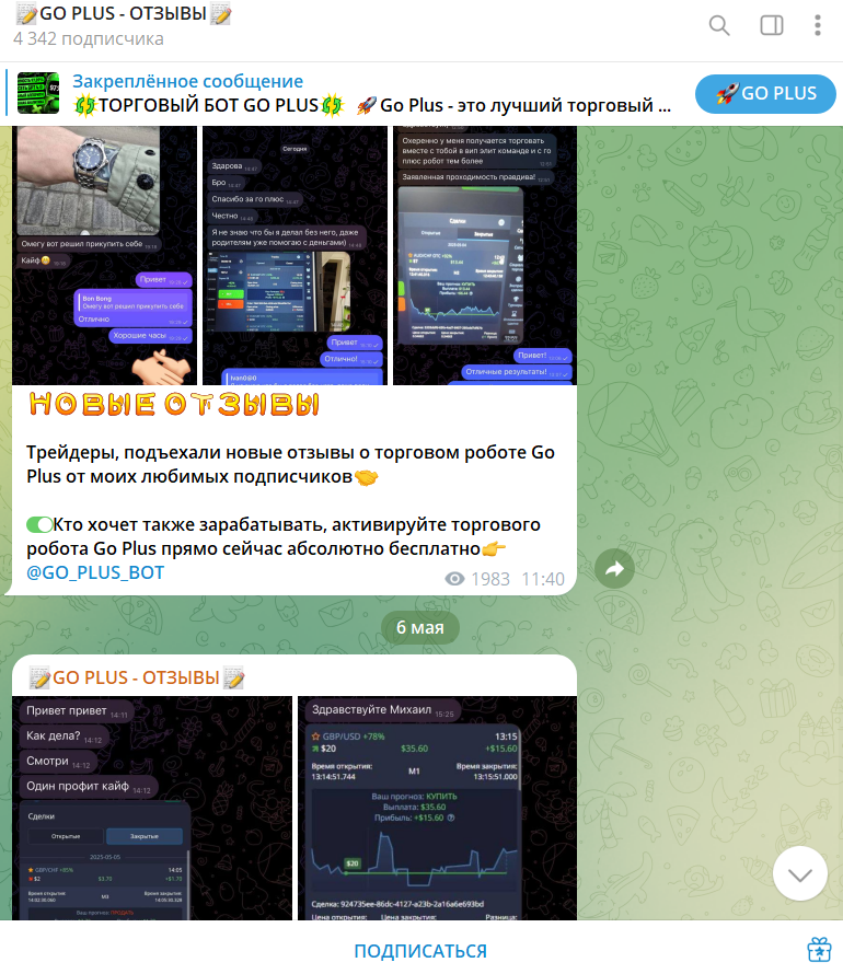 В телеграмм-канале Go Plus Bot с ником Go Plus Feedback публикуются отзывы от довольных клиентов, заключивших успешные сделки по торговым сигналам из проекта трейдера Михаила. На 07 мая 2025 года количество подписчиков группы составляет 4 326 человек, посты с сообщениями от пользователей набирают до 1 983 просмотров.У автора «Бинарного Тигра» нет сертификатов и лицензий, демонстрирующих его профессиональные знания в трейдинге. Он не показывает скрины по убыточным сигналам, что вызывает подозрения о правдивости его постоянных успехов в торговле на рынке.