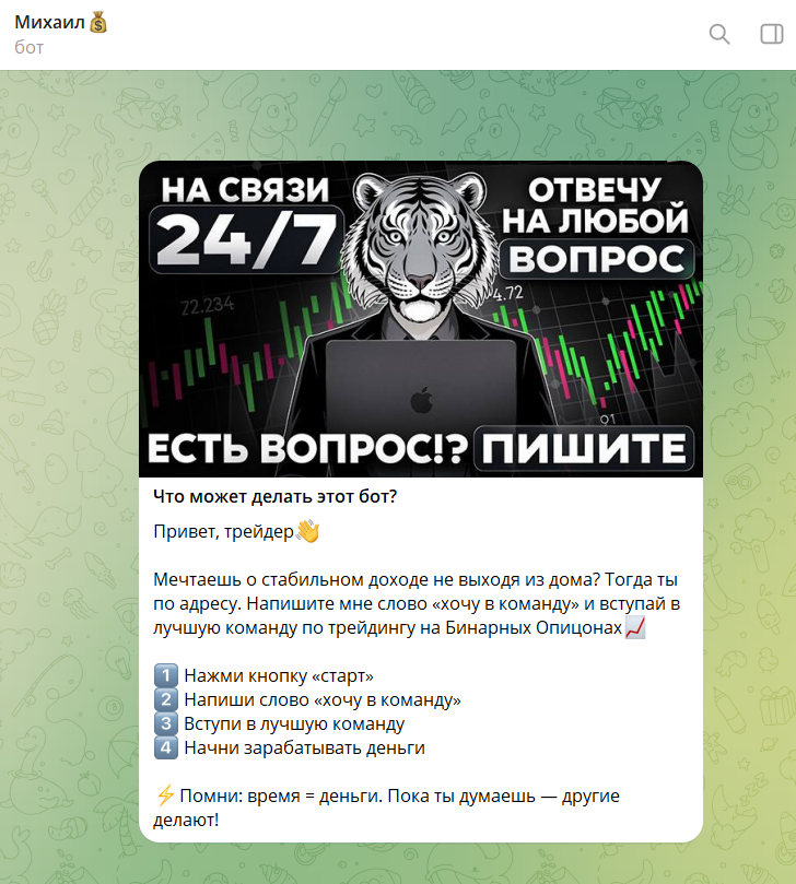 Известно, что владельца инвестиционного проекта «Бинарный Тигр» зовут Михаил, он разработал телеграмм-бота Binary Tiger Bot, через который пользователи могут вступить в команду трейдера для торговли бинарными опционами и криптой. Автор сервиса просит написать словосочетание «Хочу в команду», чтобы попасть в группу инвесторов, торгующих на канале MixaTrader.